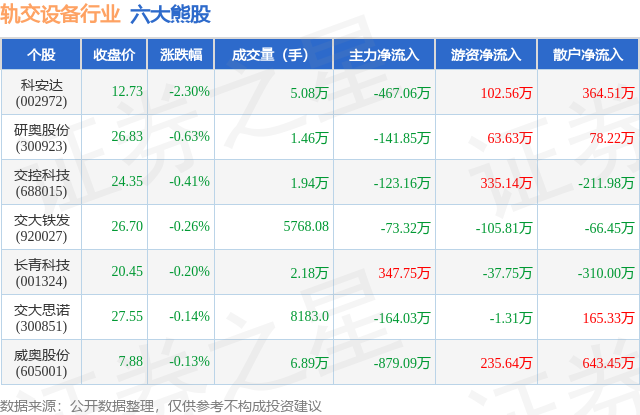 个股表现方面,轨交设备行业当日领跌股为科安达(002972),该股当日报收12.73,下跌2.3%,成交量5.08万,主力资金净流出467.06万元。研奥股份(300923)以下跌0.63%紧随其后,该股当日成交量1.46万,主力资金净流出141.85万元。除此之外,交控科技(688015)、交大铁发(920027)、长青科技(001324)均进入当日熊股之列。具体个股列表见下表: