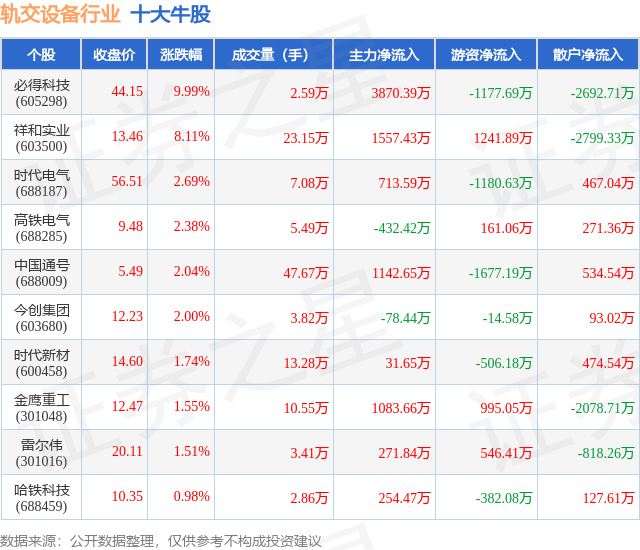 个股表现方面,轨交设备行业当日领涨股为必得科技(605298),该股当日报收44.15,上涨9.99%,成交量2.59万,主力资金净流入3870.39万元。祥和实业(603500)以上涨8.11%紧随其后,该股当日成交量23.15万,主力资金净流入1557.43万元。除此之外,时代电气(688187)、高铁电气(688285)、中国通号(688009)均进入当日牛股之列。具体个股列表见下表: