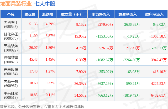 个股表现方面,地面兵装行业当日领涨股为国科军工(688543),该股当日报收51.33,上涨4.29%,成交量8.15万,主力资金净流入3279.9万元。甘化科工(000576)以上涨3.87%紧随其后,该股当日成交量15.95万,主力资金净流出1353.33万元。除此之外,天秦装备(300922)、捷强装备(300875)、光电股份(600184)均进入当日牛股之列。具体个股列表见下表:
