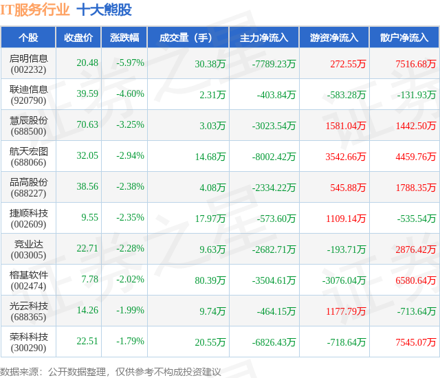 个股表现方面,IT服务行业当日领跌股为启明信息(002232),该股当日报收20.48,下跌5.97%,成交量30.38万,主力资金净流出7789.23万元。联迪信息(920790)以下跌4.6%紧随其后,该股当日成交量2.31万,主力资金净流出403.84万元。除此之外,慧辰股份(688500)、航天宏图(688066)、品高股份(688227)均进入当日熊股之列。具体个股列表见下表: