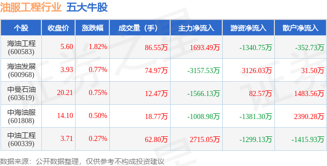 个股表现方面,油服工程行业当日领涨股为海油工程(600583),该股当日报收5.6,上涨1.82%,成交量86.55万,主力资金净流入1693.49万元。海油发展(600968)以上涨0.77%紧随其后,该股当日成交量74.97万,主力资金净流出3157.53万元。除此之外,中曼石油(603619)、中海油服(601808)、中油工程(600339)均进入当日牛股之列。具体个股列表见下表: