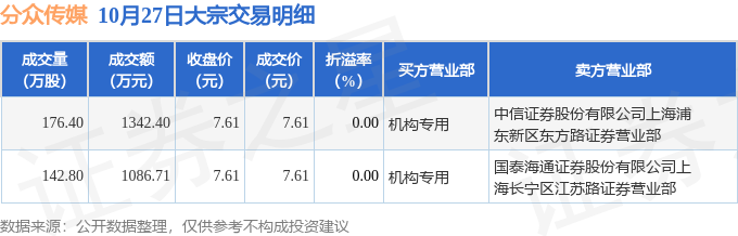 证券之星消息,10月27日分众传媒发生大宗交易,交易数据如下: