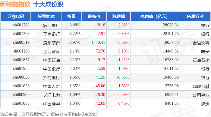 证券之星消息,10月27日,新综指(000017)指数报收于3378.46点,涨1.18%,成交10266.44亿元,换手率1.34%。当日该指数成份股中,上涨的有1405家,星环科技以16.47%的涨幅领涨,下跌的有701家,惠泰医疗以13.44%的跌幅领跌。