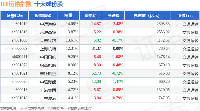 证券之星消息,10月27日,180运输(000027)指数报收于767.46点,涨0.4%,成交63.53亿元,换手率0.43%。当日该指数成份股中,上涨的有9家,中远海控以2.48%的涨幅领涨,下跌的有3家,中远海能以1.47%的跌幅领跌。