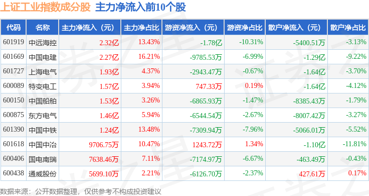 资金流向方面,上证工业(000034)指数成份股当日主力资金净流入合计6.98亿元,游资资金净流出合计2.51亿元,散户资金净流出合计4.47亿元。成份股资金流向详情见下表: