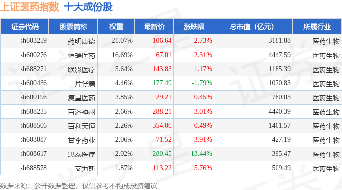 证券之星消息,10月27日,上证医药(000037)指数报收于7012.99点,涨1.05%,成交287.35亿元,换手率1.16%。当日该指数成份股中,上涨的有34家,艾力斯以5.76%的涨幅领涨,下跌的有15家,惠泰医疗以13.44%的跌幅领跌。