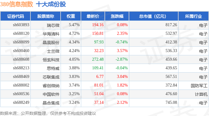 证券之星消息,10月27日,380信息(000111)指数报收于10303.9点,涨1.89%,成交468.65亿元,换手率3.14%。当日该指数成份股中,上涨的有38家,景旺电子以10.0%的涨幅领涨,下跌的有7家,恒玄科技以2.87%的跌幅领跌。