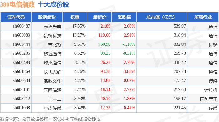 证券之星消息,10月27日,380电信(000112)指数报收于5895.48点,涨1.23%,成交162.7亿元,换手率1.86%。当日该指数成份股中,上涨的有11家,威胜信息以4.05%的涨幅领涨,下跌的有10家,吉比特以1.18%的跌幅领跌。
