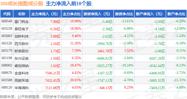 资金流向方面,380成长(000117)指数成份股当日主力资金净流入合计15.27亿元,游资资金净流出合计10.27亿元,散户资金净流出合计5.0亿元。成份股资金流向详情见下表: