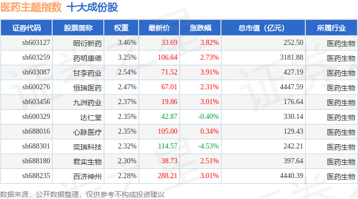 证券之星消息,10月27日,医药主题(000121)指数报收于8668.39点,涨0.43%,成交301.3亿元,换手率1.32%。当日该指数成份股中,上涨的有35家,艾力斯以5.76%的涨幅领涨,下跌的有14家,惠泰医疗以13.44%的跌幅领跌。