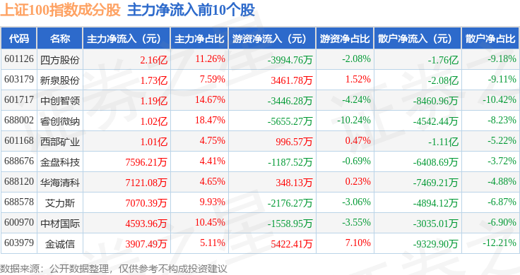 资金流向方面,上证100(000132)指数成份股当日主力资金净流出合计4.53亿元,游资资金净流入合计1.85亿元,散户资金净流入合计2.68亿元。成份股资金流向详情见下表: