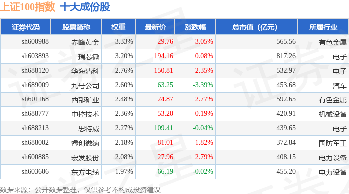 证券之星消息,10月27日,上证100(000132)指数报收于6049.09点,涨0.78%,成交552.61亿元,换手率1.85%。当日该指数成份股中,上涨的有63家,纽威股份以10.0%的涨幅领涨,下跌的有36家,惠泰医疗以13.44%的跌幅领跌。