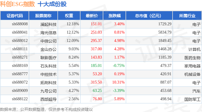 证券之星消息,10月27日,科创ESG(000691)指数报收于1548.63点,涨2.04%,成交610.73亿元,换手率1.71%。当日该指数成份股中,上涨的有32家,拓荆科技以10.31%的涨幅领涨,下跌的有18家,惠泰医疗以13.44%的跌幅领跌。