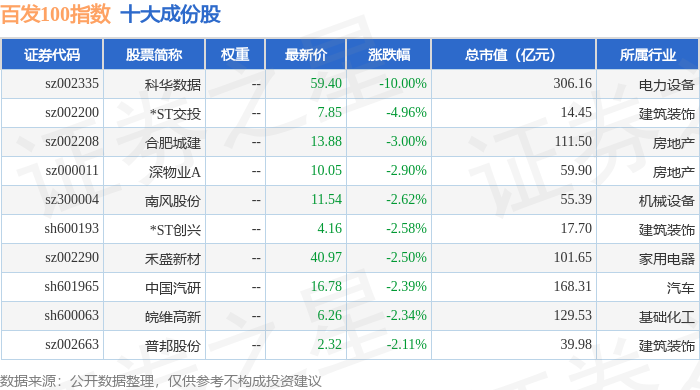 证券之星消息,10月27日,百发100(000851)指数报收于20337.86点,涨0.96%,成交718.6亿元,换手率1.8%。当日该指数成份股中,上涨的有48家,亚太股份以5.68%的涨幅领涨,下跌的有34家,科华数据以10.0%的跌幅领跌。
