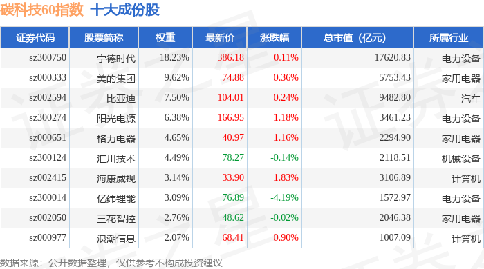 证券之星消息,10月27日,碳科技60(399060)指数报收于3406.2点,涨0.64%,成交1494.99亿元,换手率2.16%。当日该指数成份股中,上涨的有44家,湖南裕能以8.99%的涨幅领涨,下跌的有14家,晶盛机电以4.59%的跌幅领跌。