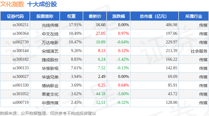 证券之星消息,10月27日,文化指数(399248)报收于922.03点,跌0.16%,成交78.33亿元,换手率3.18%。当日该指数成份股中,上涨的有10家,幸福蓝海以3.4%的涨幅领涨,下跌的有11家,荣信文化以4.84%的跌幅领跌。