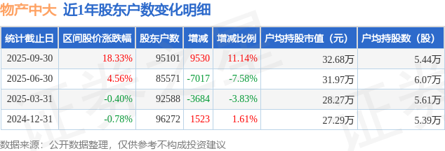 从股价来看,2025年6月30日至2025年9月30日,物产中大区间涨幅为18.33%,在此期间股东户数增加9530.0户,增幅为11.14%。