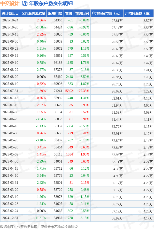 从股价来看,2025年10月20日至2025年10月24日,中交设计区间涨幅为2.36%,在此期间股东户数减少61.0户,减幅为0.09%。