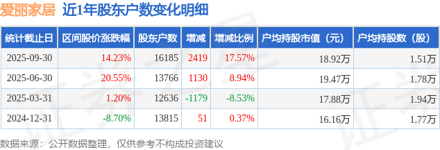 从股价来看,2025年6月30日至2025年9月30日,爱丽家居区间涨幅为14.23%,在此期间股东户数增加2419.0户,增幅为17.57%。