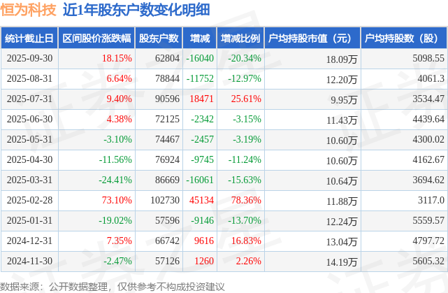 从股价来看,2025年8月31日至2025年9月30日,恒为科技区间涨幅为18.15%,在此期间股东户数减少1.6万户,减幅为20.34%。