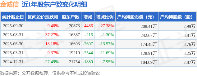 从股价来看,2025年8月31日至2025年9月30日,金诚信区间涨幅为9.4%,在此期间股东户数增加4486.0户,增幅为27.38%。
