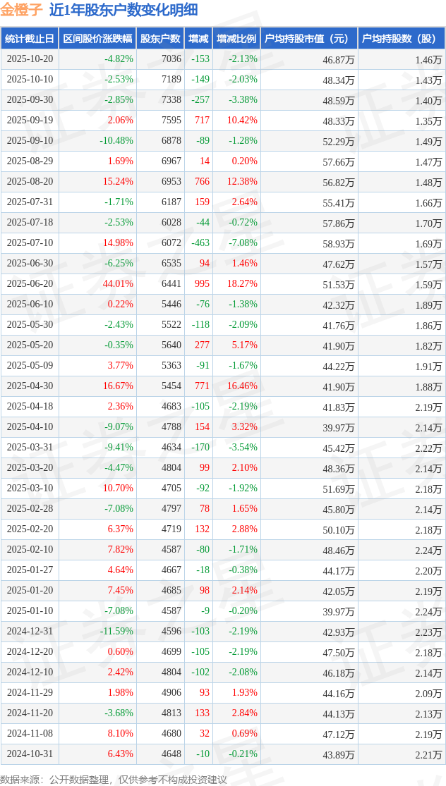 从股价来看,2025年10月10日至2025年10月20日,金橙子区间跌幅为4.82%,在此期间股东户数减少153.0户,减幅为2.13%。