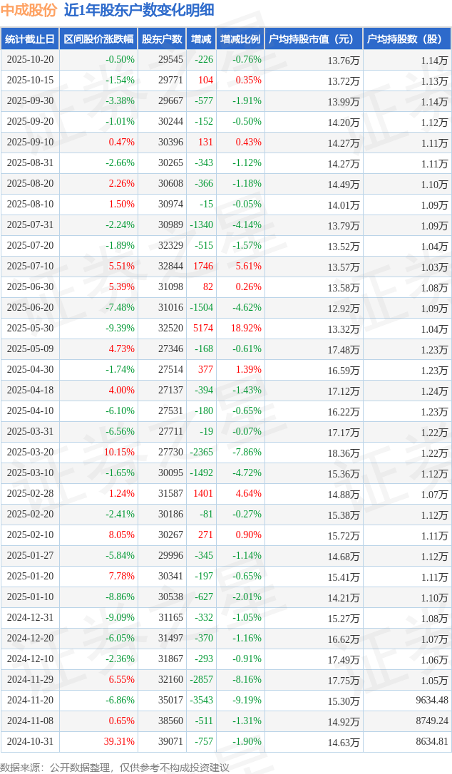 从股价来看,2025年10月15日至2025年10月20日,中成股份区间跌幅为0.5%,在此期间股东户数减少226.0户,减幅为0.76%。