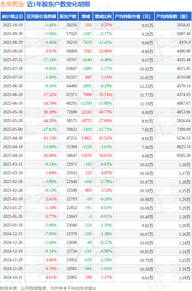 从股价来看,2025年9月30日至2025年10月10日,永安药业区间跌幅为1.44%,在此期间股东户数增加333.0户,增幅为0.57%。