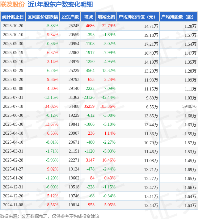 从股价来看,2025年10月10日至2025年10月20日,联发股份区间跌幅为5.83%,在此期间股东户数增加4686.0户,增幅为22.79%。
