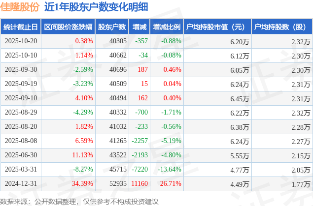从股价来看,2025年10月10日至2025年10月20日,佳隆股份区间涨幅为0.38%,在此期间股东户数减少357.0户,减幅为0.88%。