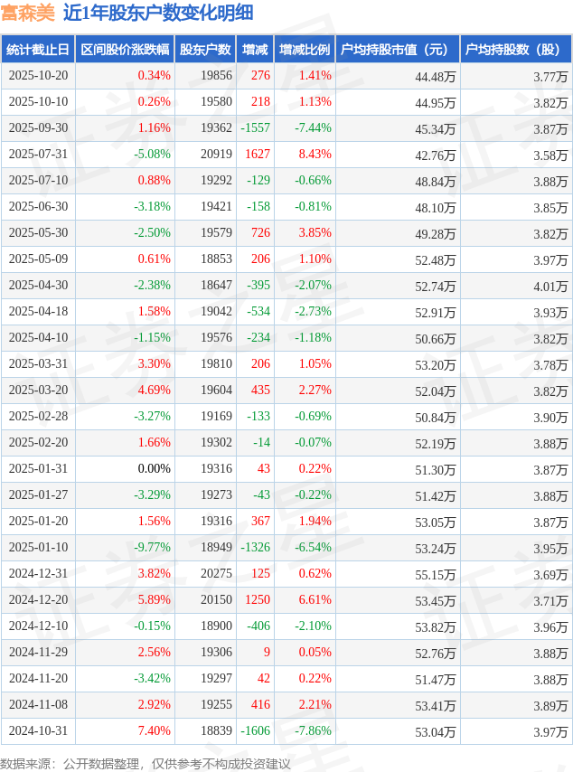 从股价来看,2025年10月10日至2025年10月20日,富森美区间涨幅为0.34%,在此期间股东户数增加276.0户,增幅为1.41%。