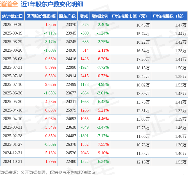从股价来看,2025年9月19日至2025年9月30日,道道全区间涨幅为1.82%,在此期间股东户数减少575.0户,减幅为2.4%。