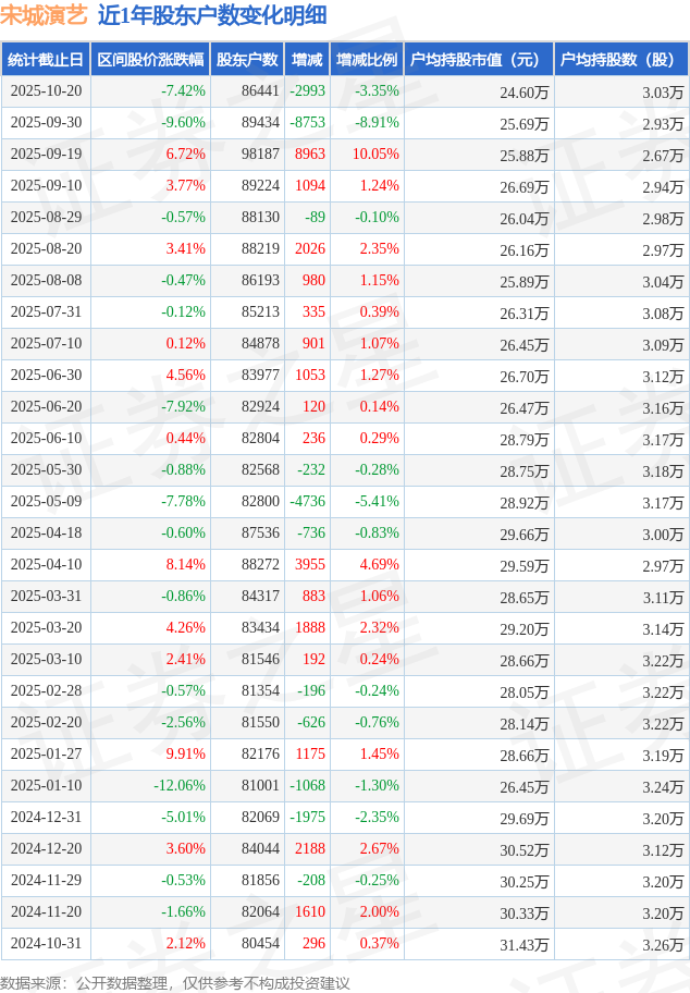 从股价来看,2025年9月30日至2025年10月20日,宋城演艺区间跌幅为7.42%,在此期间股东户数减少2993.0户,减幅为3.35%。