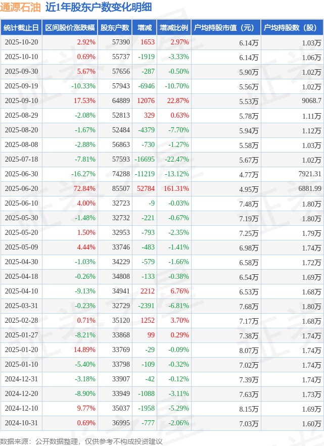 从股价来看,2025年10月10日至2025年10月20日,通源石油区间涨幅为2.92%,在此期间股东户数增加1653.0户,增幅为2.97%。