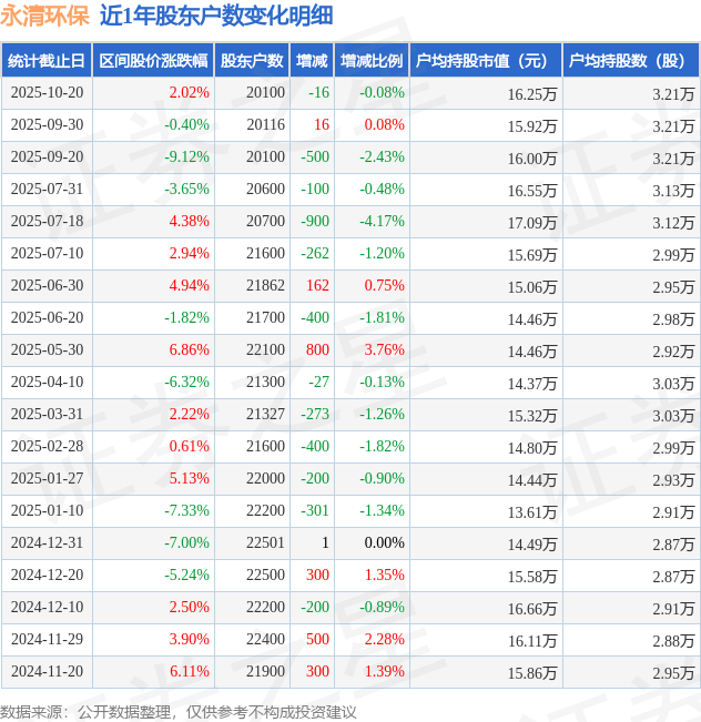 从股价来看,2025年9月30日至2025年10月20日,永清环保区间涨幅为2.02%,在此期间股东户数减少16.0户,减幅为0.08%。