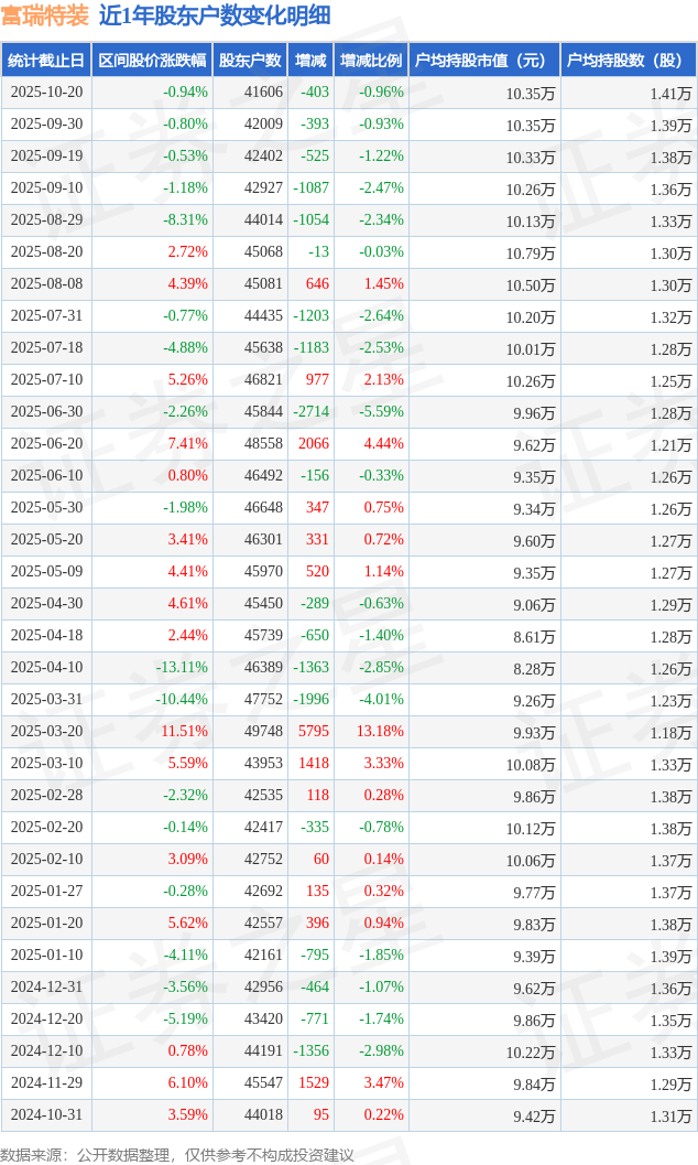 从股价来看,2025年9月30日至2025年10月20日,富瑞特装区间跌幅为0.94%,在此期间股东户数减少403.0户,减幅为0.96%。