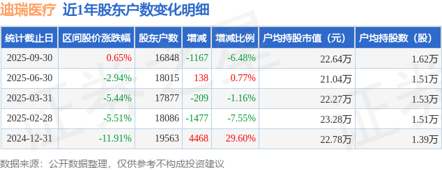从股价来看,2025年6月30日至2025年9月30日,迪瑞医疗区间涨幅为0.65%,在此期间股东户数减少1167.0户,减幅为6.48%。