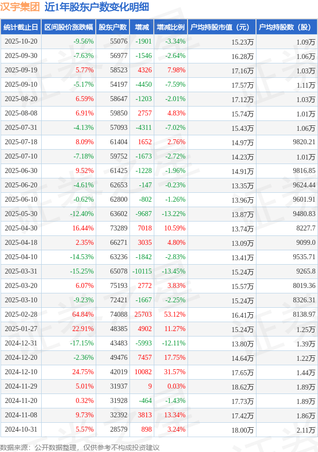 从股价来看,2025年9月30日至2025年10月20日,汉宇集团区间跌幅为9.56%,在此期间股东户数减少1901.0户,减幅为3.34%。
