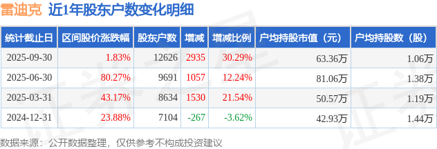 从股价来看,2025年6月30日至2025年9月30日,雷迪克区间涨幅为1.83%,在此期间股东户数增加2935.0户,增幅为30.29%。