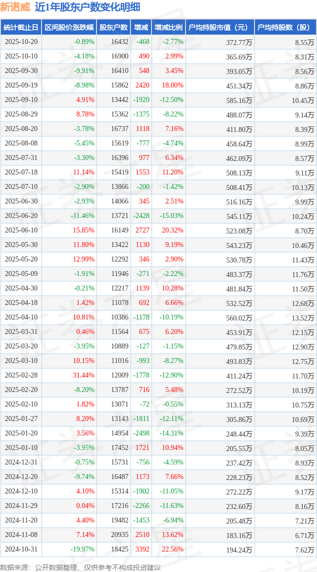 从股价来看,2025年10月10日至2025年10月20日,新诺威区间跌幅为0.89%,在此期间股东户数减少468.0户,减幅为2.77%。