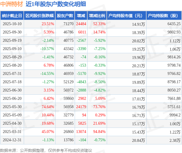 从股价来看,2025年9月30日至2025年10月10日,中洲特材区间涨幅为23.51%,在此期间股东户数增加2.45万户,增幅为52.33%。