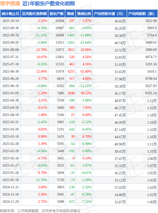 从股价来看,2025年9月30日至2025年10月10日,恒宇信通区间涨幅为2.55%,在此期间股东户数增加297.0户,增幅为2.97%。