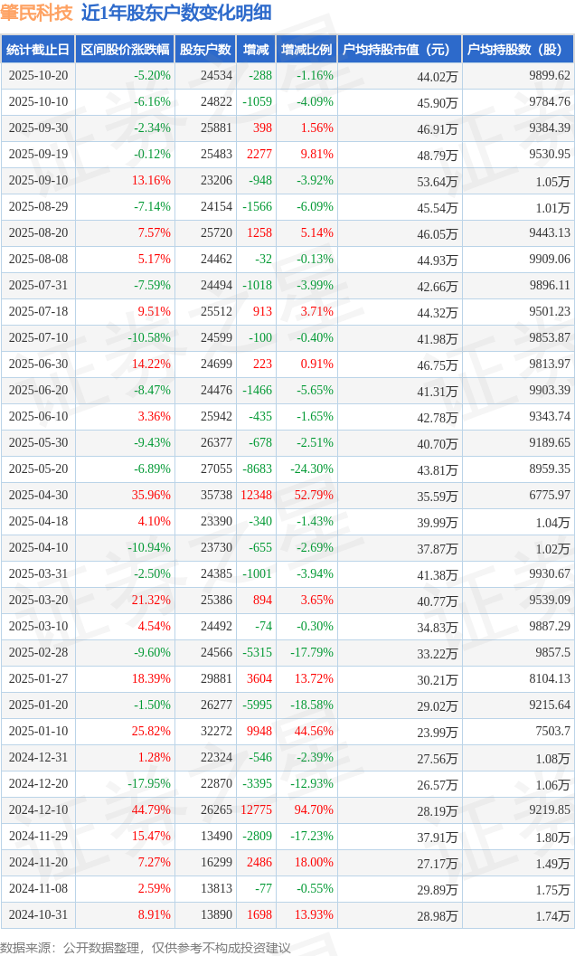 从股价来看,2025年10月10日至2025年10月20日,肇民科技区间跌幅为5.2%,在此期间股东户数减少288.0户,减幅为1.16%。