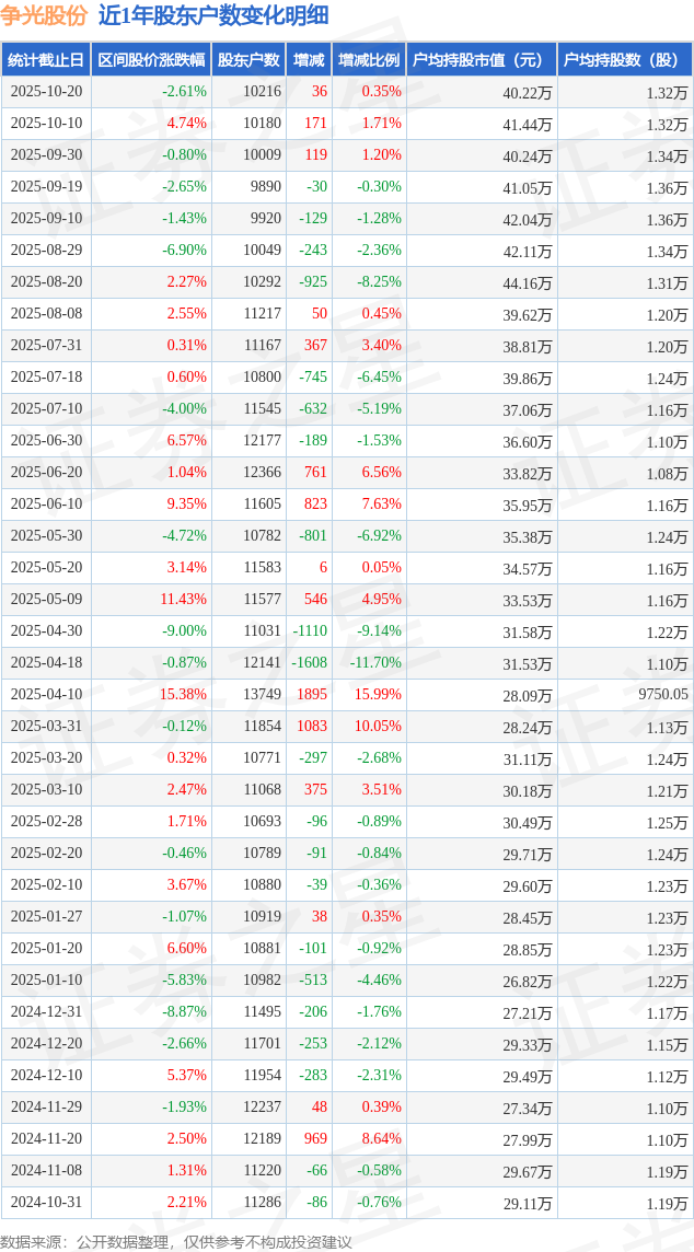 从股价来看,2025年10月10日至2025年10月20日,争光股份区间跌幅为2.61%,在此期间股东户数增加36.0户,增幅为0.35%。