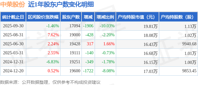 从股价来看,2025年8月31日至2025年9月30日,中荣股份区间跌幅为1.46%,在此期间股东户数减少1906.0户,减幅为10.03%。
