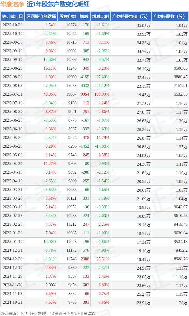 从股价来看,2025年10月10日至2025年10月20日,华康洁净区间涨幅为1.54%,在此期间股东户数减少170.0户,减幅为1.61%。