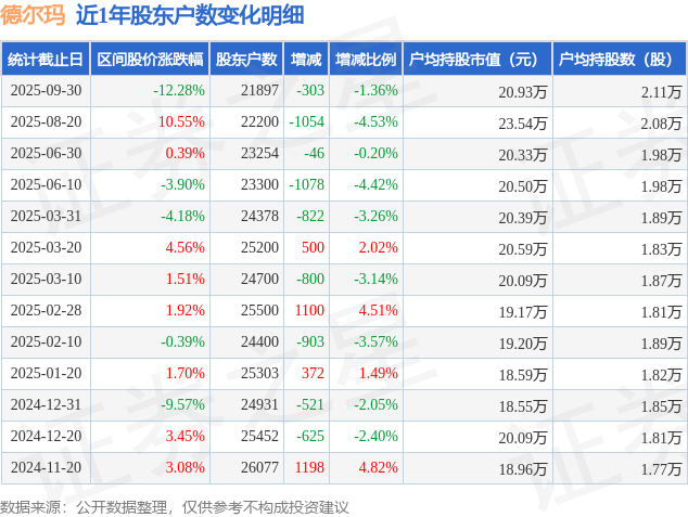 从股价来看,2025年8月20日至2025年9月30日,德尔玛区间跌幅为12.28%,在此期间股东户数减少303.0户,减幅为1.36%。
