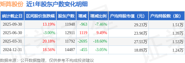 从股价来看,2025年6月30日至2025年9月30日,矩阵股份区间涨幅为13.19%,在此期间股东户数减少963.0户,减幅为7.46%。