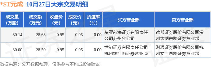证券之星消息,10月27日*ST元成发生大宗交易,交易数据如下: