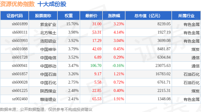 证券之星消息,10月27日,资源优势(399319)指数报收于3141.93点,涨1.83%,成交1207.61亿元,换手率1.35%。当日该指数成份股中,上涨的有69家,厦门钨业以10.0%的涨幅领涨,下跌的有25家,石化油服以4.53%的跌幅领跌。